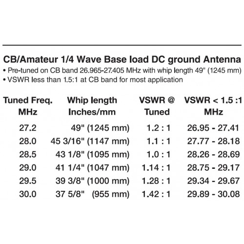 T1140 - Antenne CB 26.5-30MHz, ajustable, 1/4 d'onde, gain unitaire, DC Ground, whip en SS 49po, 200..